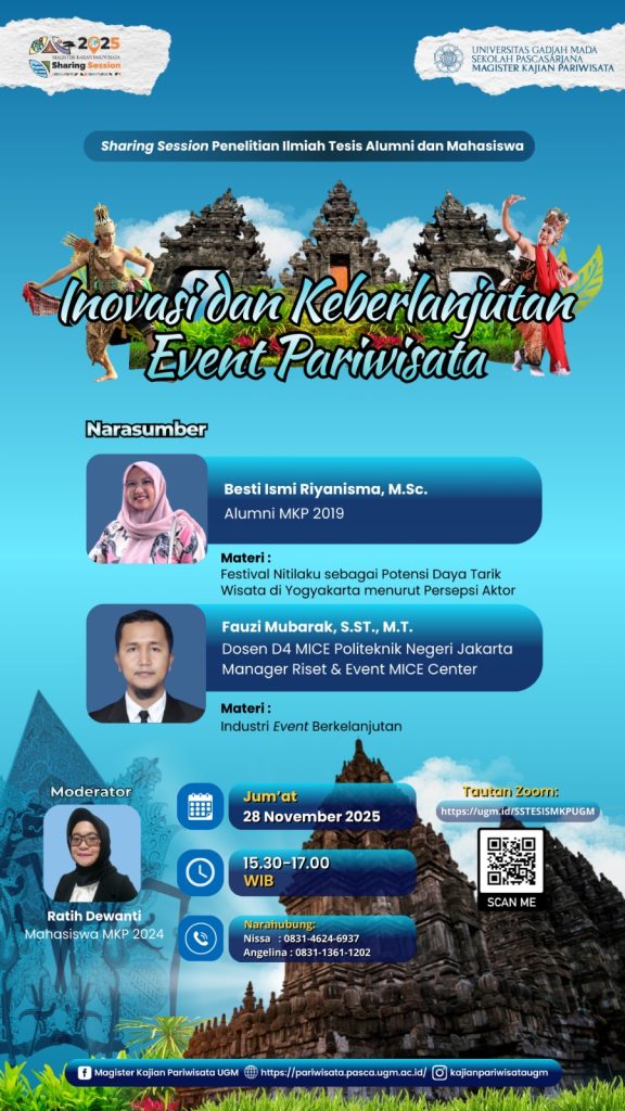 Sharing Session Penelitian Ilmiah Tesis Alumni dan Mahasiswa MKP UGM sesi keenam yang merupakan sesi terakhir pada periode ini, telah dilaksanakan pada Jumat, 28 November 2025 mengangkat tema Event Pariwisata dimana ...