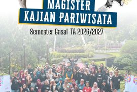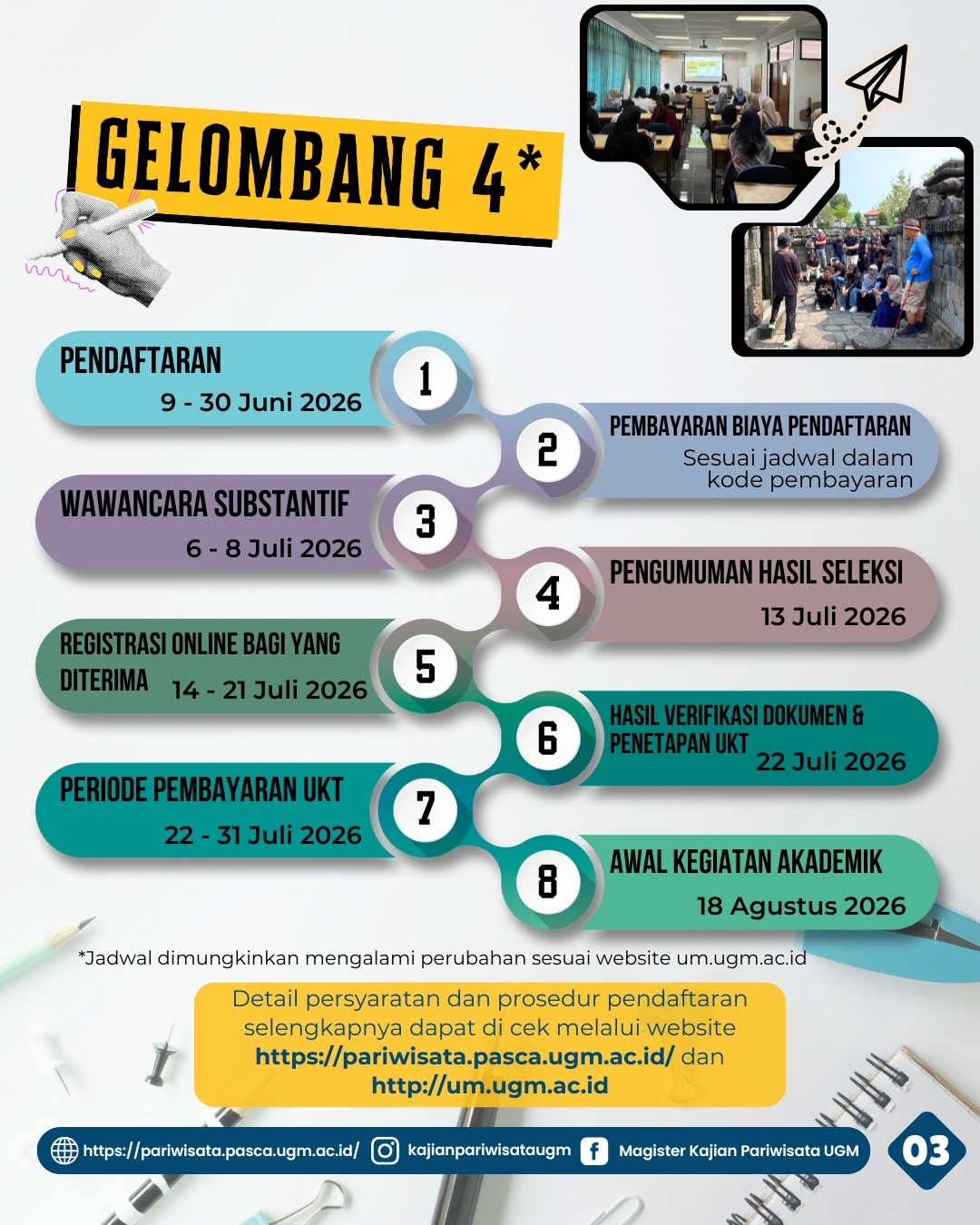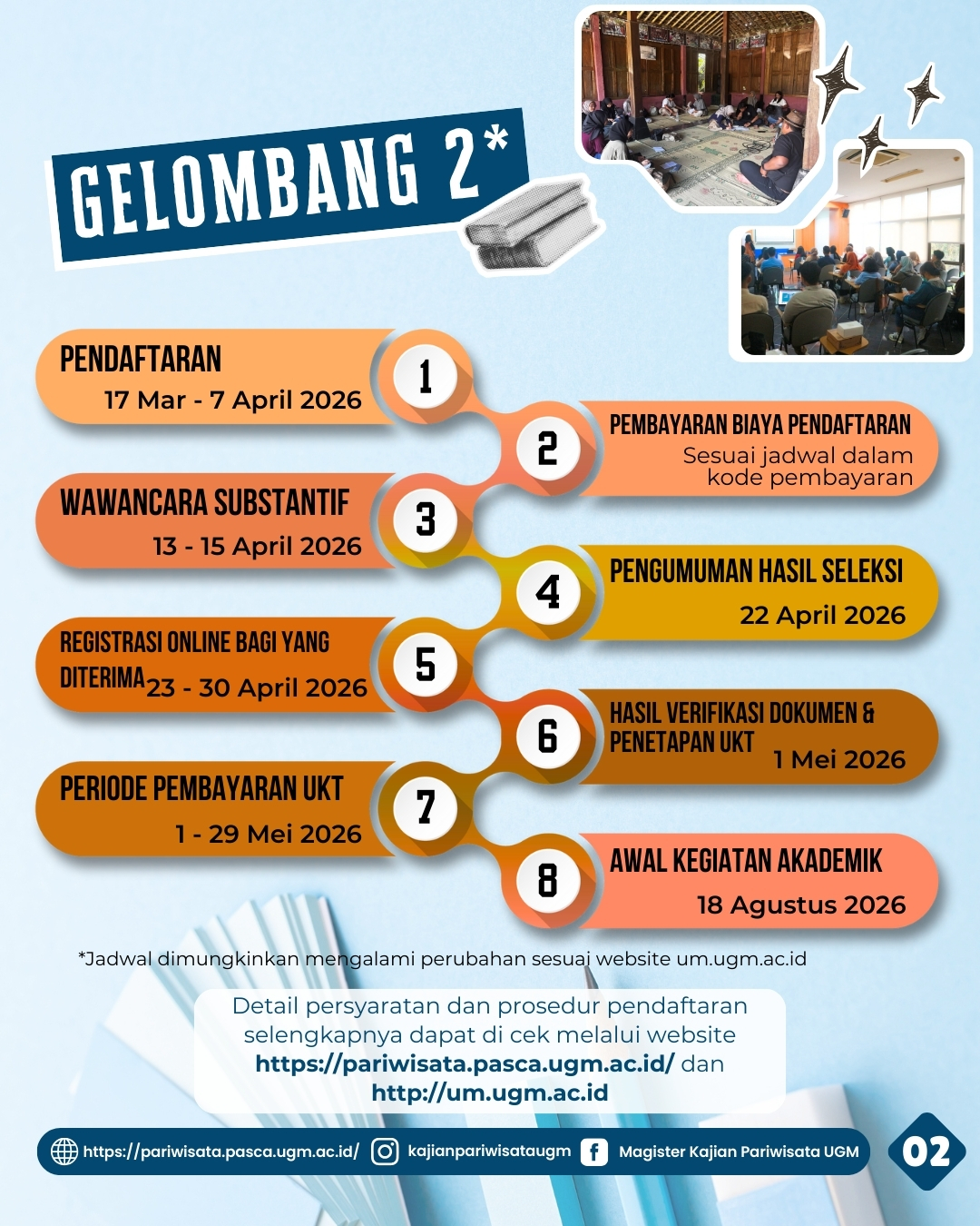 Program Studi Magister Kajian Pariwista UGM membuka pendaftaran mahasiswa baru untuk Tahun Angkatan 2026/2027. Pendaftaran dibuka pada dua gelombang, yaitu pada 17 Maret – 7 April 2026 untuk Gelombang 2, serta 9-30 Juni untuk Gelombang 4. Awal kegiatan akademik akan dimulai pada bulan Agustus 2026. Persyaratan dan informasi selengkapnya dapat dicermati pada link berikut: